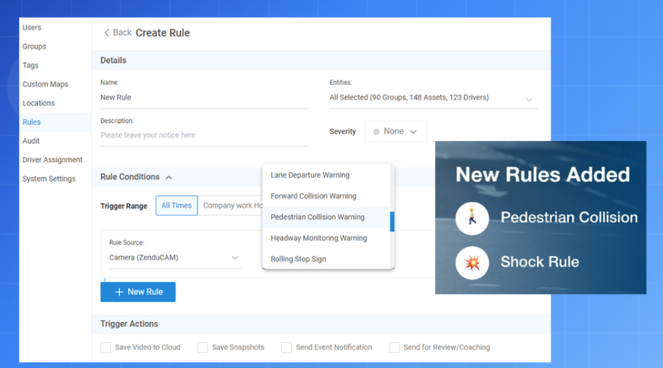 These updates significantly improve vehicle safety by providing proactive alerts to prevent pedestrian accidents and detect collisions based on sudden changes in force. The addition of these rules enhances the ZenCAM systemโ€™s ability to monitor critical driving conditions, improving overall fleet safety and reducing the risk of accidents. Your feedback on these new rules will help us refine them and ensure they provide the most value to users.