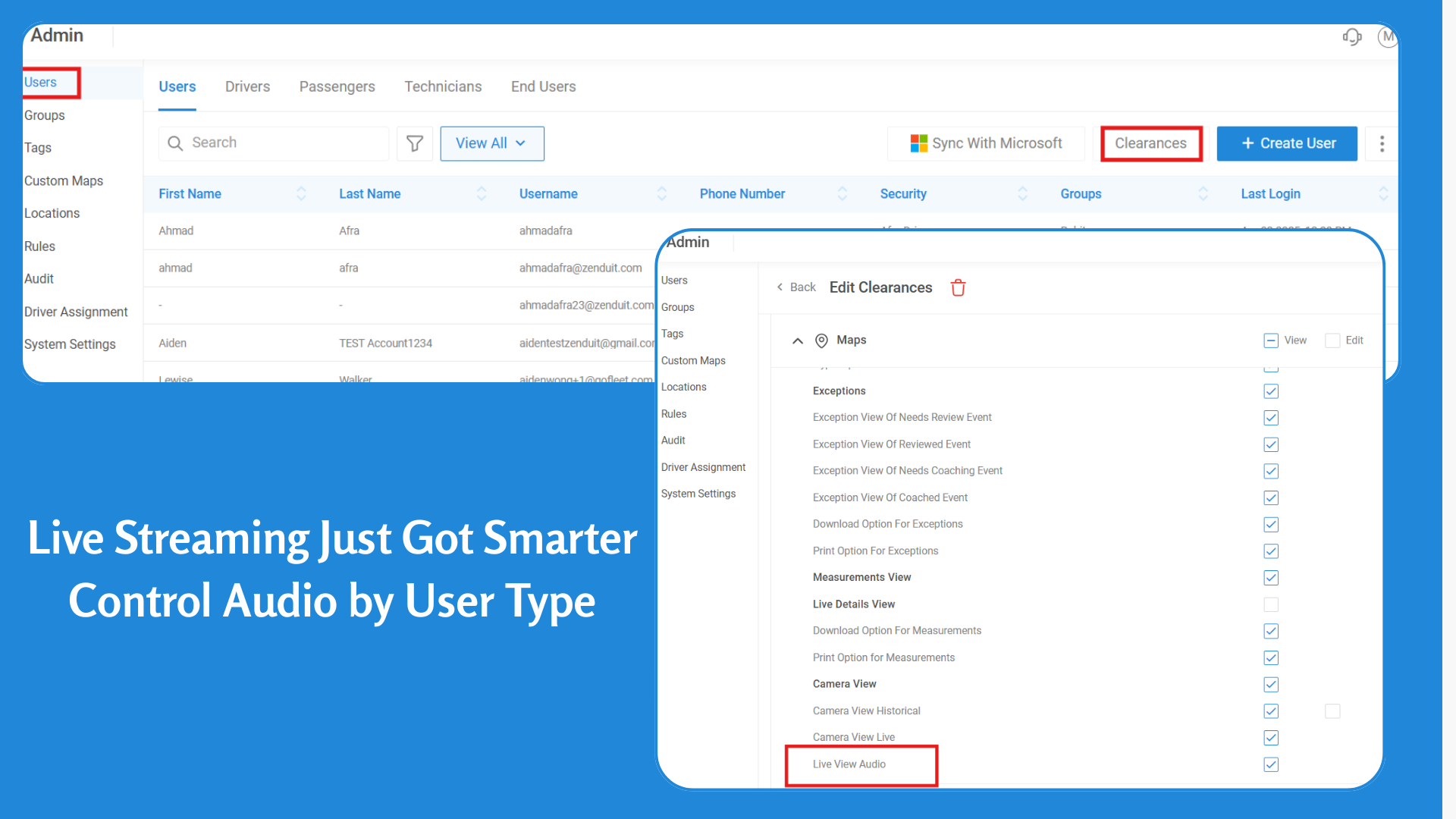 Admins now have enhanced control over live streaming audio settings, allowing them to enable or disable audio access specifically for dispatchers or managers. These settings can be customized directly from the user clearance page.