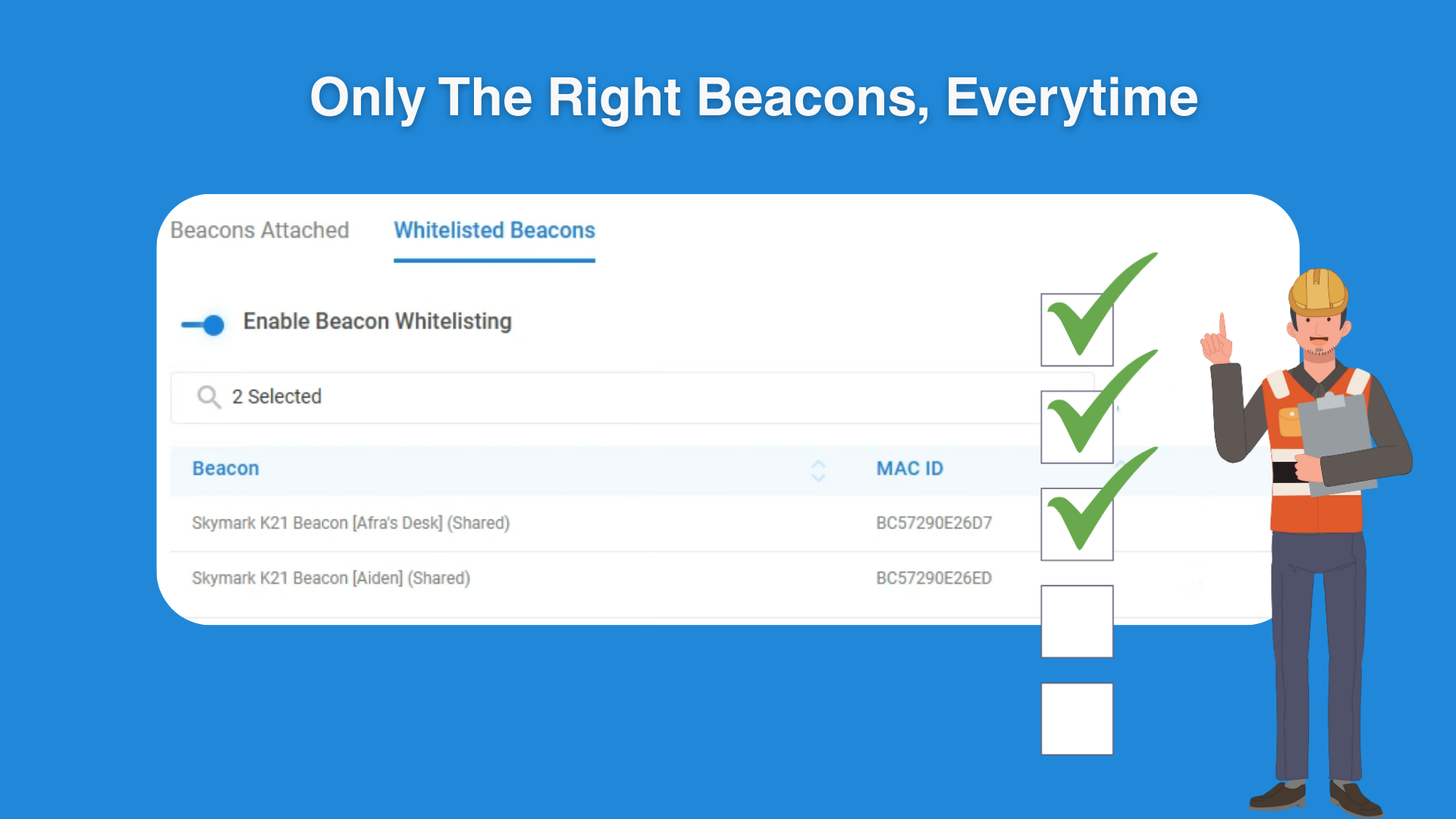 Select individual beacons through a searchable list.