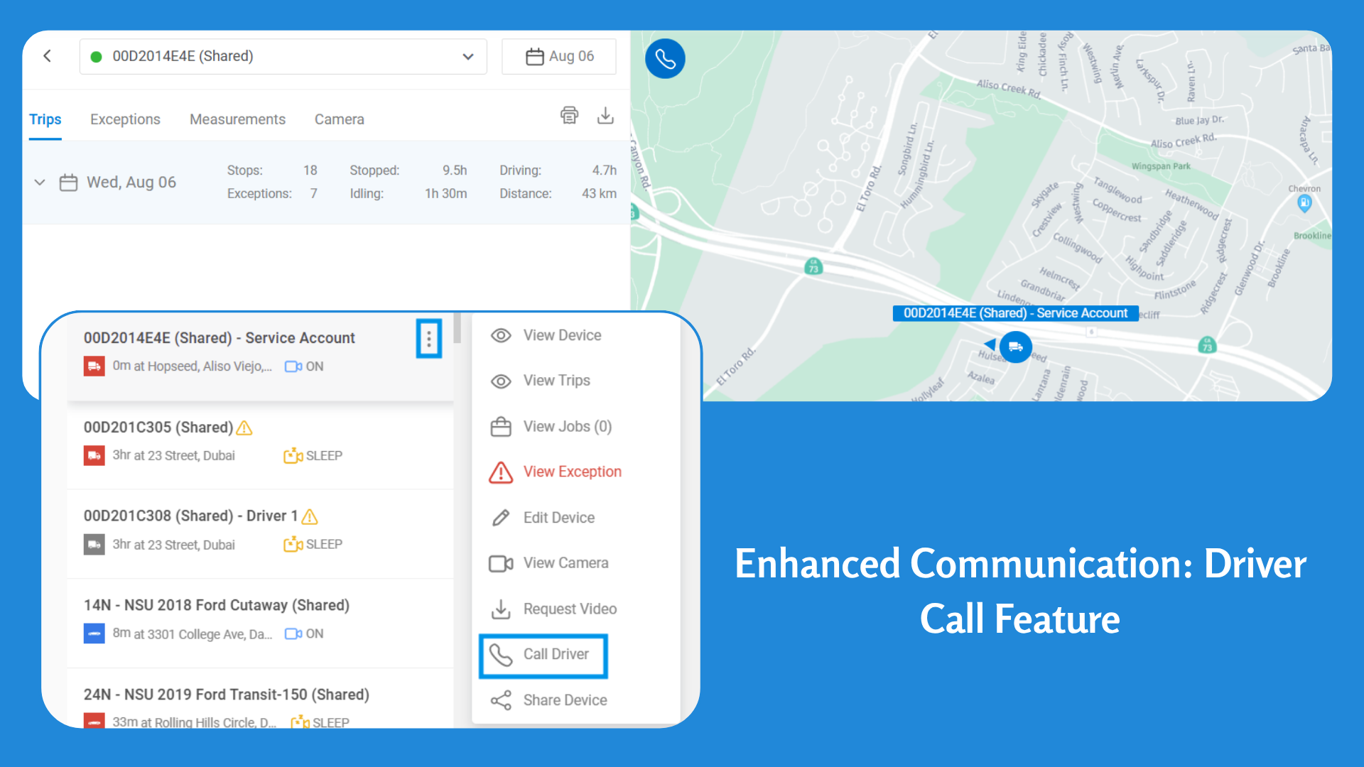 This update enhances fleet communication by streamlining the process of reaching drivers. It reduces dependency on external devices or apps, enables immediate contact in urgent situations, and improves overall operational efficiency and safety by allowing users to stay within the platform while communicating with drivers.