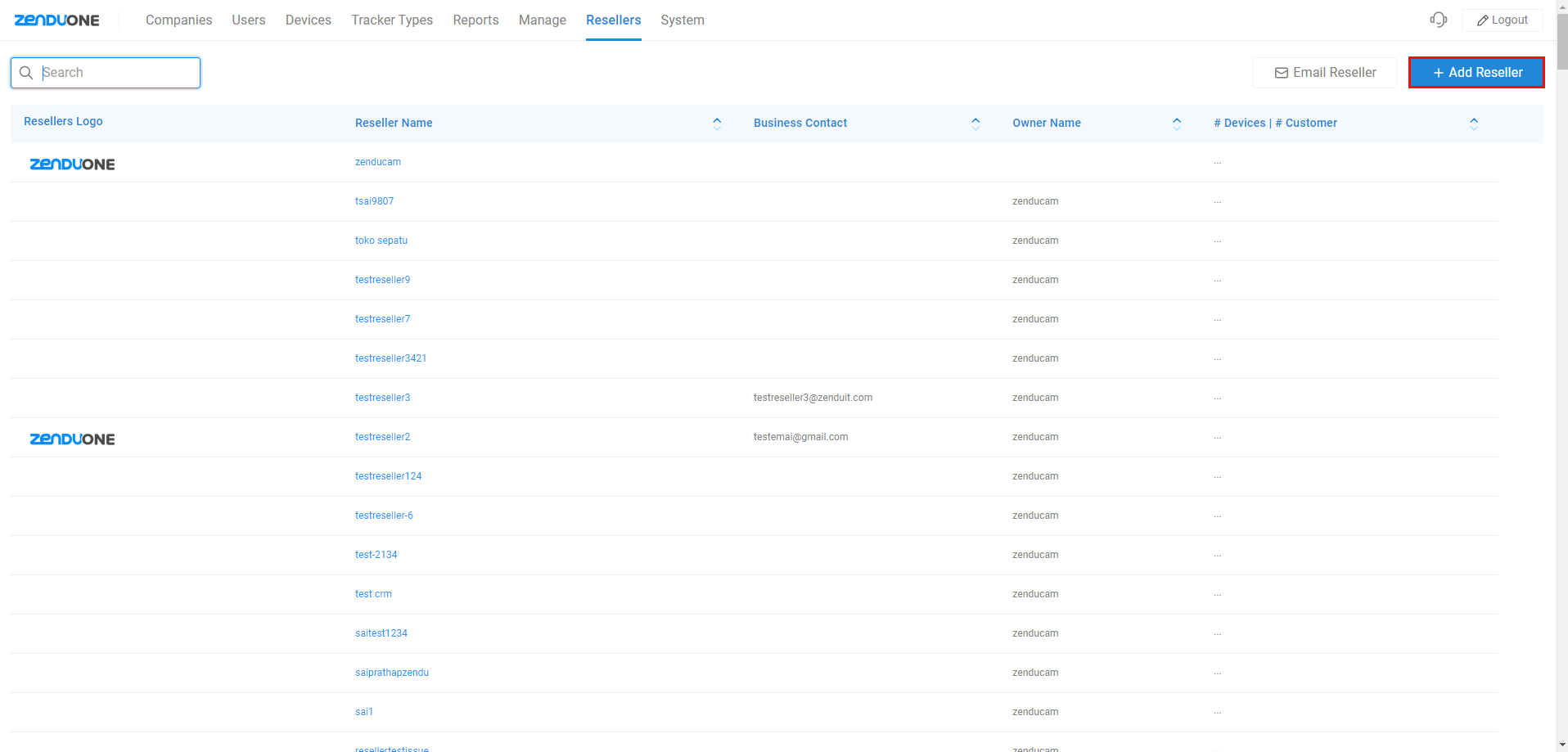 In the ZenduONE Admin portal, head to the "Resellers" tab and click on + Add Reseller in the top right corner to begin.