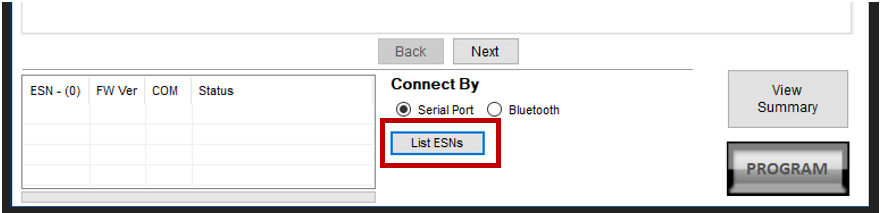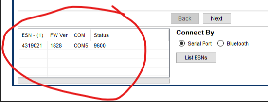 The serial number (ESN) of the device should appear in the list at the bottom left.